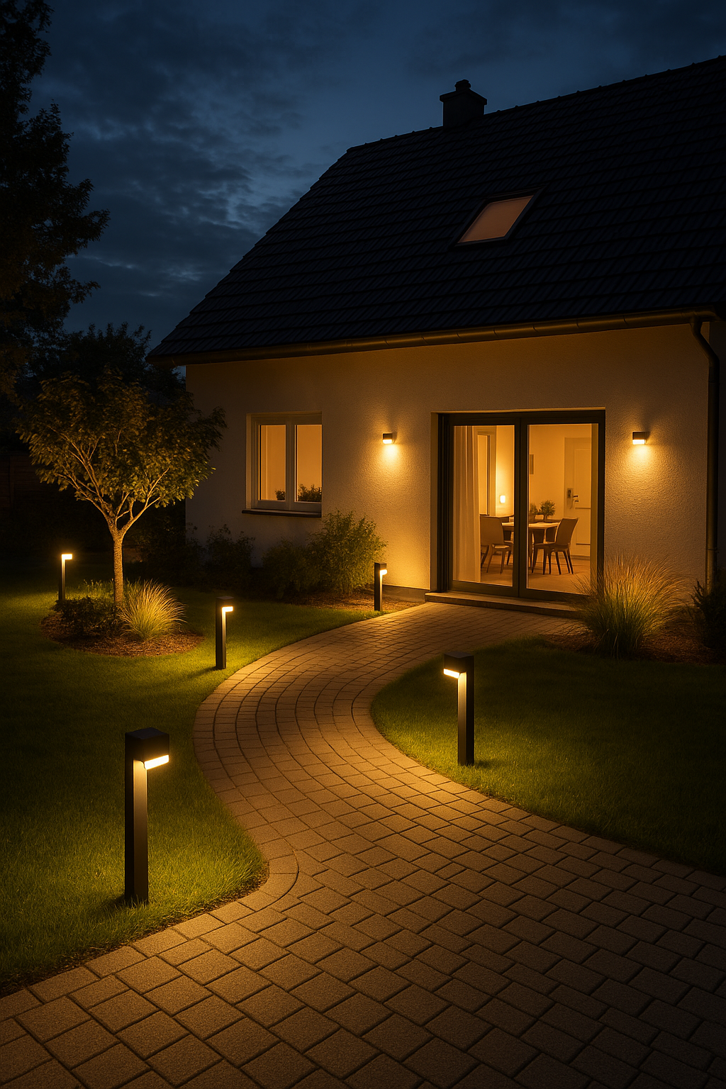 - Kombination von Wandleuchten, Wegleuchten, Bodenspots und Bewegungsmeldern – abgestimmt auf Ihre Anforderungen.